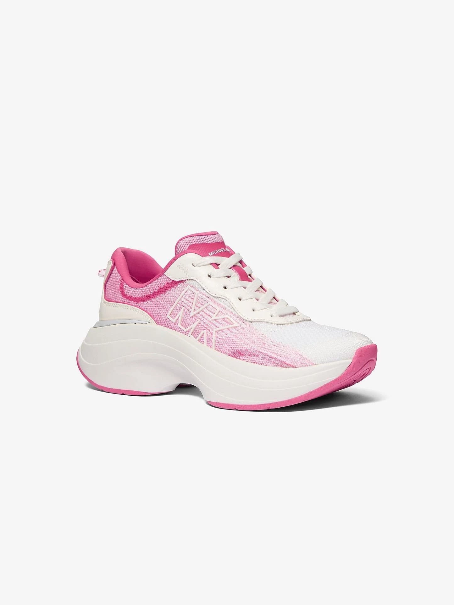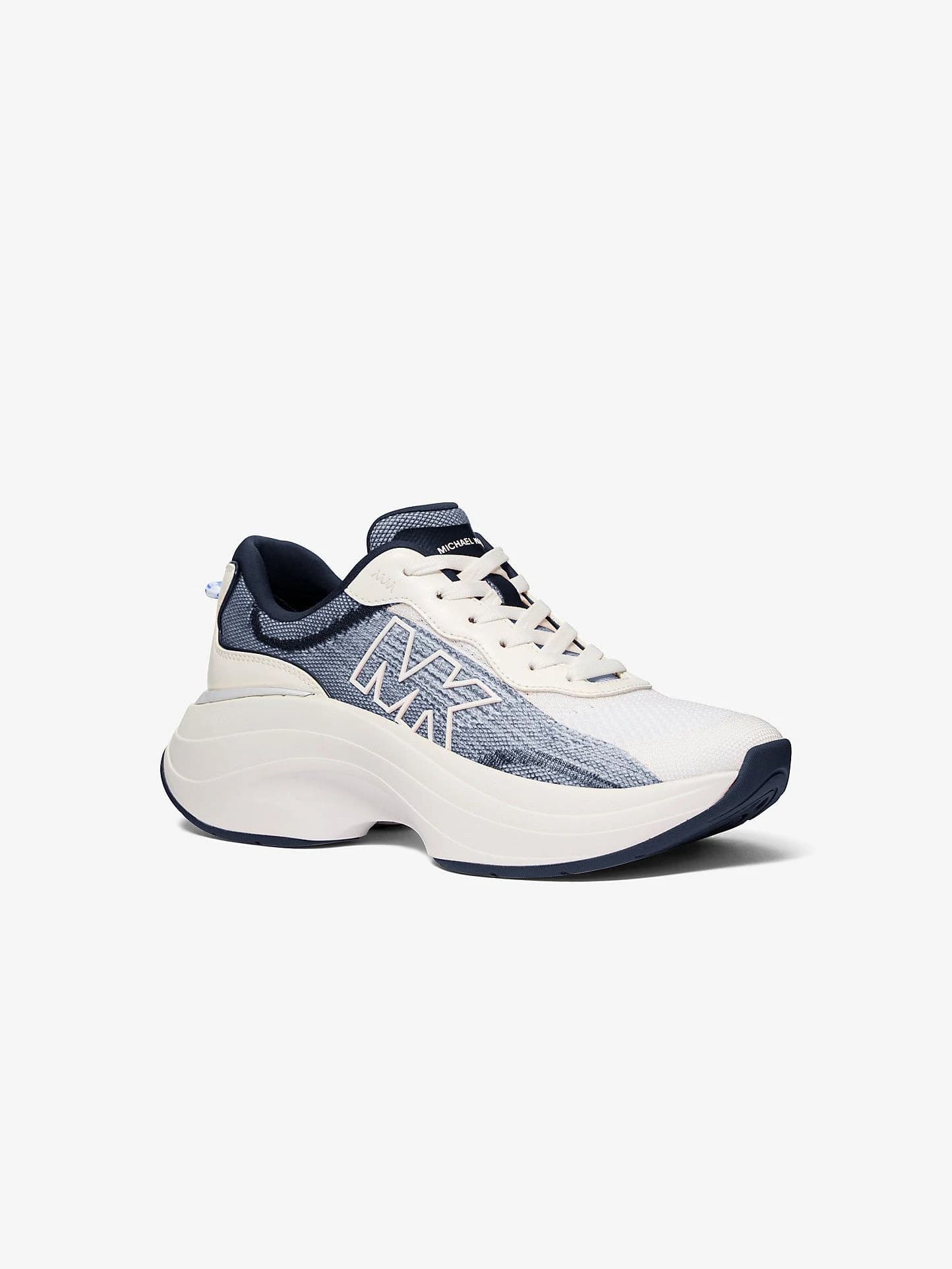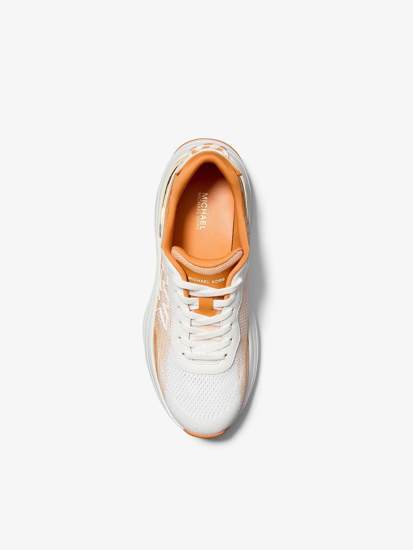 Athena Ombré Stretch Knit Trainer en blanco con toques naranjas. Diseño moderno y deportivo con suela gruesa y materiales transpirables que combinan comodidad y estilo. Ideal para looks urbanos y actividades activas.