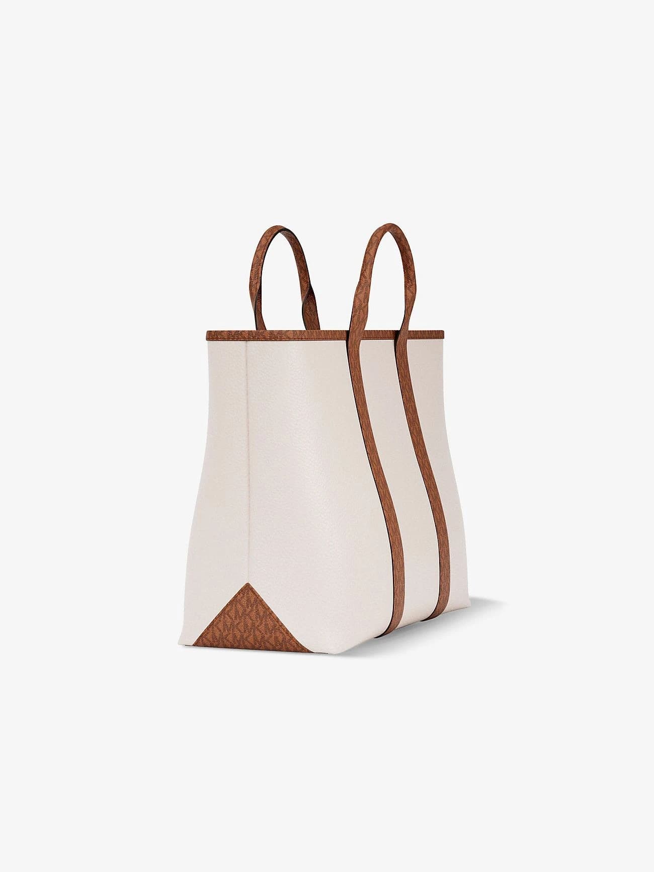 Tote de cuero pebbled en color crema con detalles en marrón. Diseño limpio y moderno, ideal para uso diario. Cuenta con manija de cuero y acabados refinados que resaltan su elegancia.