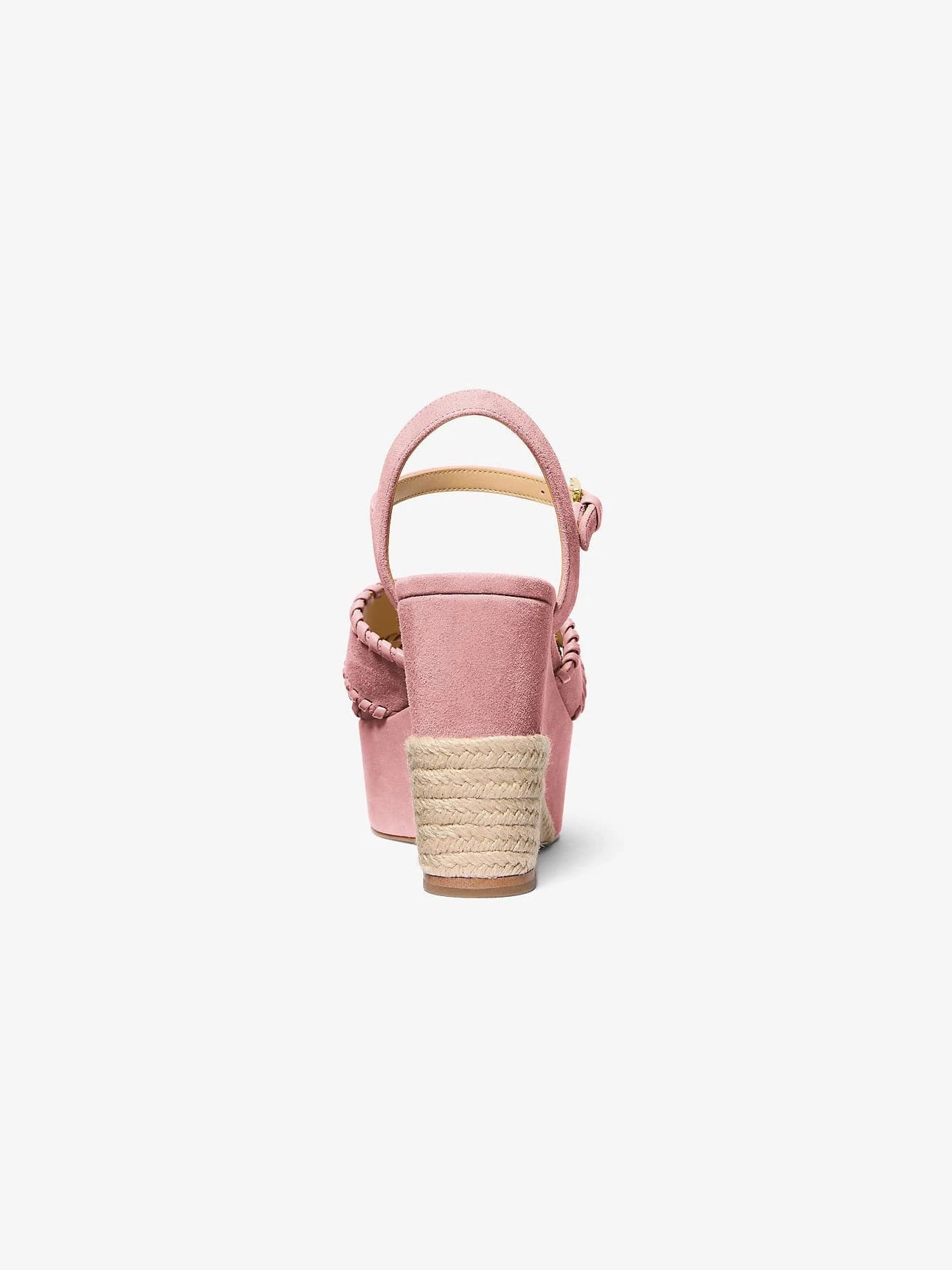 Hannah Suede Platform Sandal de Michael Kors en tono rosa suave. Cuenta con un emblema dorado decorativo y una suela de espadriña beige que brinda soporte y estilo. La cinta ajustable con hebilla pequeña completa el diseño elegante y versátil.