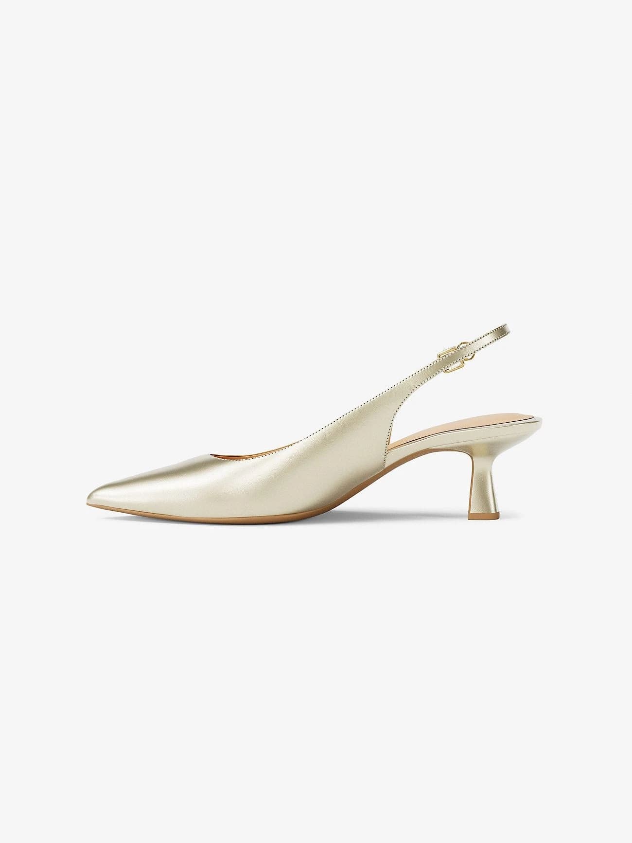 Amali Metallic Pump, un modelo de cuero crema con un diseño sofisticado y elegante. El tacón redondeado y delgado se complementa con un cinturón ajustable que añade un toque de lujo. Ideal para ocasiones formales, este zapato destaca por su estilo chic y suaves líneas.