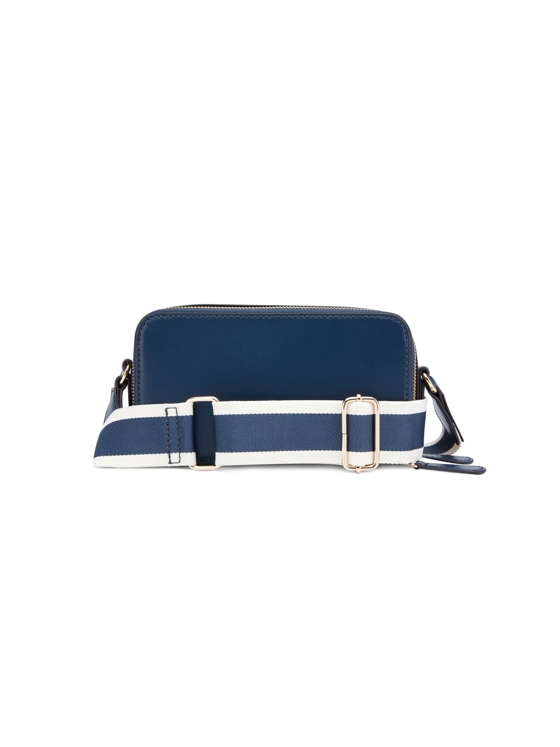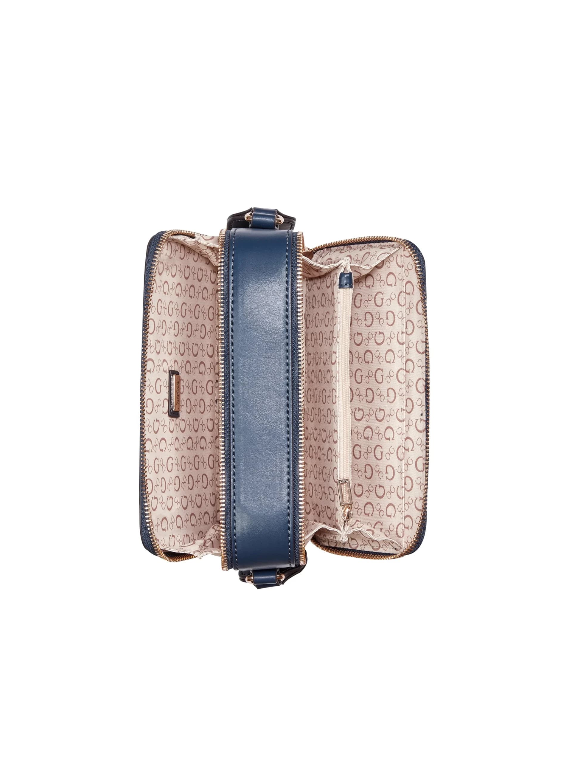 Carrara Double-Zip Mini Crossbody en azul marino. Cuenta con un cierre de cremallera y un hombro ajustable, ideal para complementar looks casuales o elegantes. Su material suave y lujoso le da un toque moderno y sofisticado. Perfecta para llevar con confianza y estilo.