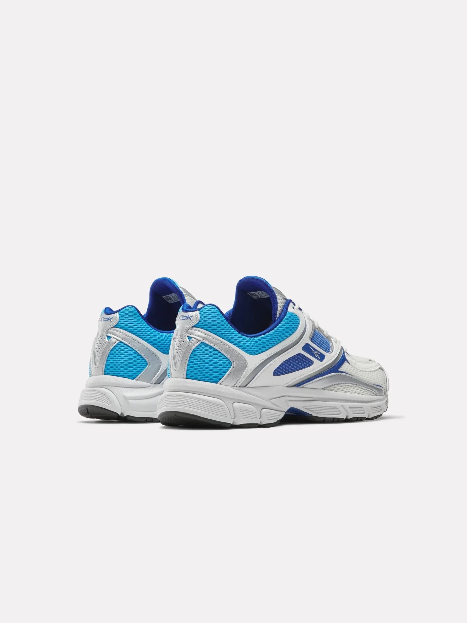 Zapatos de entrenamiento Reebok Premier Trinity en blanco y azul, con upper de malla y suela amortecida. Diseño moderno que combina materiales sintéticos y malla para respirabilidad y soporte. Ideales para actividades deportivas y entrenamientos intensos.